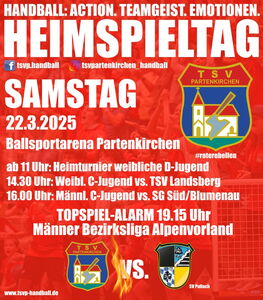 Beim vorletzten Heimspieltag des Jahres am kommenden Samstag will unsere weibliche D-Jugend nach ihrem Aufstieg in die Bezirksliga einen weiteren Heimsieg einfahren. Ab 11 Uhr geht es gegen ganz starke Gegner aus Pullach und Herrsching. Für unsere weibliche B-Jugend steht auch ein Entscheidungsspiel an. Kann das Team von Trainerin Johanna Saul gegen Landsberg gewinnen, sichert man sich vorerst Platz 3 in der Bezirksoberliga. Den Buben der männlichen C-Jugend steht mit der SG Süd/Blumenau ein schier übermächtiger Gegner gegenüber. Wir setzen auf Heimspielatmosphäre.