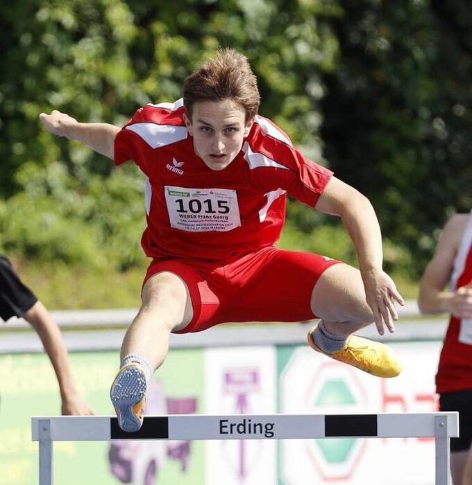 Dieser eine ist Franz Georg Weber. Das Nachwuchstalent von der LAG Garmisch-Partenkirchen reiste mit dem Ziel an, seine Qualifikationszeit über die 300-Meter-Hürden – es war eh schon die beste der M15 – zu drücken. Das gelang ihm. Nach 41,65 Sekunden überquerte er die Ziellinie als bayerischer Meister. Dadurch wurde er zudem ins bayerische Team für den Verbände-Vergleichskampf in Hösbach (13. bis 15. September) berufen. Über die 80-Meter-Hürden sicherte sich Weber die zweite Medaille. Seine 11,30 Sekunden wurden nur von einem Kontrahenten übertroffen, womit er Silber holte. Beim 100-Meter-Sprint hingegen war für ihn im Vorlauf Schluss (12,24 Sekunden). Auch beim Kugelstoßen konnte er kein Wörtchen bei der Medaillenvergabe mitsprechen, wurde mit 11,34 Metern Elfter.