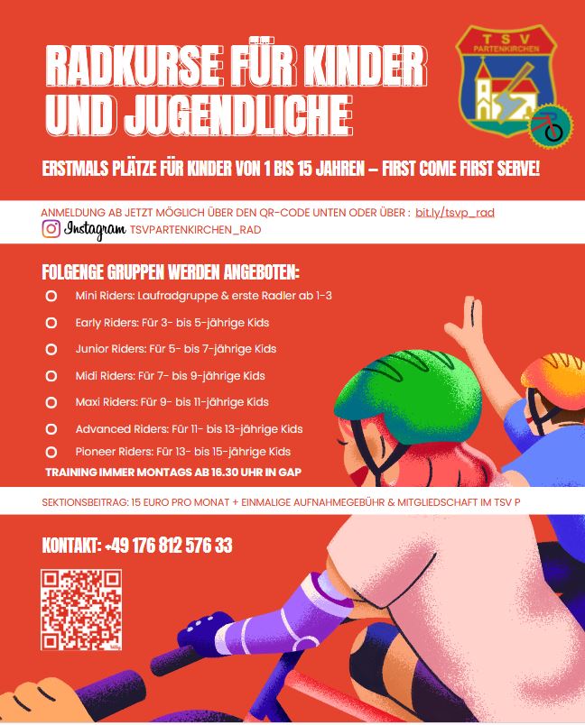 Unter neuer Führung wird die Radsportabteilung des TSV 1899 Partenkirchen ab dem 31. März 2025 wiederbelebt, wobei sich die neue Abteilungsleitung um Susi Bräu auf den Breitensport konzentriert und dabei vor allem auf Kinder im Alter zwischen 1 und 15 Jahren. Kurse werden teilweise ausgebildeten Trainern ortsnah immer Montags angeboten. Ein Ausbau des Angebots ist geplant, weil schon jetzt klar ist: Die Nachfrage übersteigt bei Weitem das Angebot.