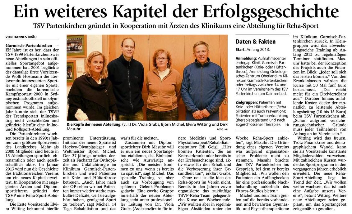 - Abteilungsbeitrag: 18 Monate kostenfrei auf Formblatt 56 (mit ärztlicher Verordnung), anschließend 20 Euro monatlich bei Vereinsmitgliedschaft im TSV Partenkirchen